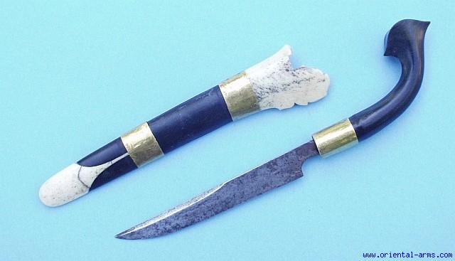 Although small with only 4 inches blade, this is a very fine item. Good blade, with clipped tip. Black horn styled handle with a gold collar. Wood sheath with bone locket and chape and gold bands. Total length almost 9 inches. Very good condition with minor age cracks on the scabbard tip.