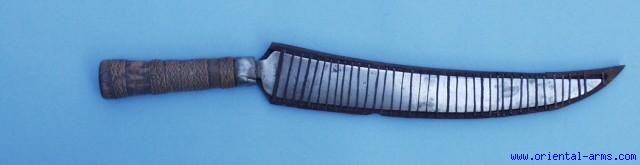 A very curious and unusual heavy knife / machete probably from the Philippines. A heavy 5/8 inches thick, 13 ½ inches long slightly up-curving blade. Wood hilt bound with braided rattan bands and an open wood scabbard with many iron strips securing the blade in place. Good condition. The blade is clean but there are signs of being re-sharpened. The hilt wood is cracked at its back side but still very solid. The tip of the scabbard is restored. Very attractive price. |