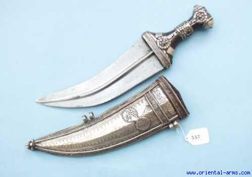 A good silver jambiya dagger from Yemen. This style is common mostly in Yemen but also in other areas in Southern Arabia. The sheath is with a shallow curvature – different from the deeply curved scabbards found in other daggers from the area. The grip is Rhino horn heavily decorated with silver.