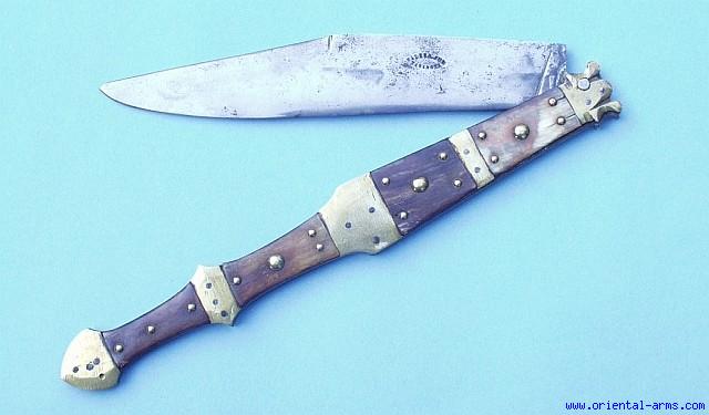 A big Spanish folding knife known also as Navaja . It was extensively used in Spain during the 18 and 19 Centuries to cut food as well as to settle personal accounts, and found as a man best companion still today. This one is a 19 Century piece made by Valero Jun from Zaragoza , signed and marked with the maker sign. 7 inches blade with a 4 inches clipped tip. Handle set with pieces of horn in various colors and brass fittings. Total length 16 inches fully opened. Very good condition. |