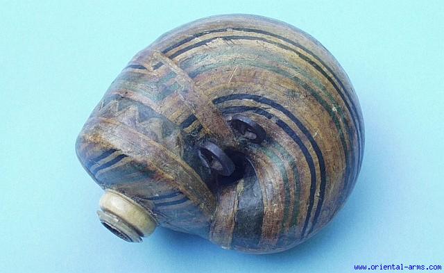 The Barudan is the General name for the Indo-Persian Powder flask. Here we offer for sale a late 18 or early 19 C. piece, made from molded paper and painted in black red green and yellow on light background. It has a spiral shape of a XXX 6 ½ inches in diameter and 3 inches thick. Bone mounted mouth and two steel hanging rings. Very good condition. Minor chips on the bone mounts. Missing plug.