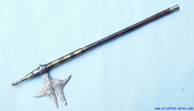 The BULLOVA is the traditional fighting axe of the Chota Nagpur aboriginal tribes of central India. It comes in a variety of blade shapes and this one has a shape of a forked one 8 X 7 ½ inches, hand forged. It is mounted on a dark wood shaft 32 inches long, through its heavy socket with two beautiful brass tips. It is a rather large example of good quality. Very good condition, attractive price. |