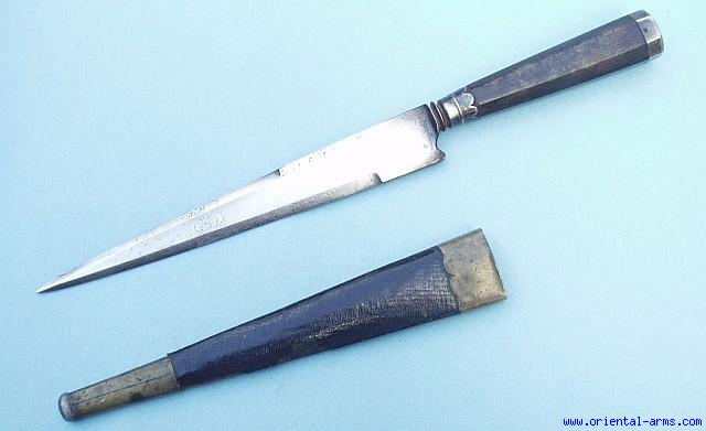 We offer for sale this beautiful real and rare Vendetta knife from Corsica, late 19 C. and one in perfect condition. These knives was used exactly for the purpose they are called: To brutally settle disputes in the family honor name. The blade of slightly hollow ground cross section, 6 ½ inches with 4 inches back edge is very sharp, tapering to an acute tip. Horn grips with silver fittings. Leather scabbard with brass fittings, all original and in excellent condition. Total length 10 ½ inches. A real quality item. |