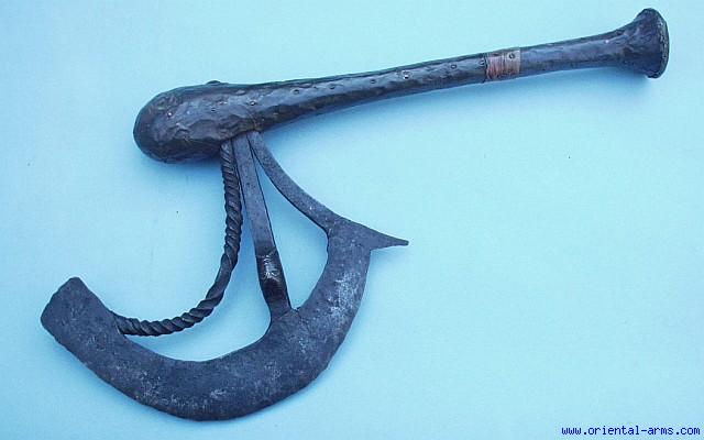 The Songye people reside in central Zaire and are known to be masters in metal work. The chiefs of the Songye families carry a axe made in a very interesting blacksmith wrought iron work. Open work blade with twisted rods and little human faces. Here is such a nice example. 10 inches blade, wood haft covered with copper and copper nails. Very good condition. Excellent age patina. |