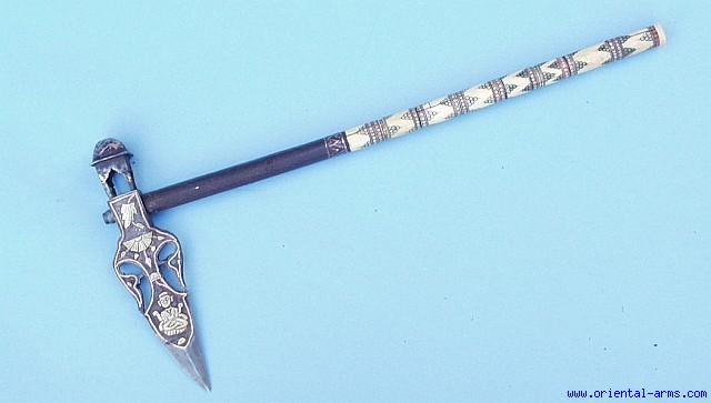We offer for sale this unusual and very good Zaghhal War axe from India.. 5 inches blade laminated steel, with armor piercing thickened tip, pierced and decorated with brass /copper inlaid figures. A small pagoda like structure on the reverse of the blade. The haft is 17 inches long, upper part from steel and lower part from Ivory cylindrical sectors, beautifully decorated with red and black circles in the style common to Northern India and Afghanistan in the late 19 C. Good condition. Minor grinding damage to the blade and minor age cracks in the ivory. Missing part on the top of the Pagoda structure. |