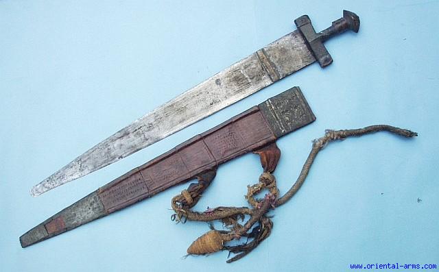 This is a very unusual Takouba sword, with a very wide blade, 29 inches long, 3 ½ inches wide at the top. The handle is steel with engraved brass covers on the lower grip and the cross guard. Tooled leather scabbard with brass mounts. Partially torn baldric suspension rope. The blade does not goe all the way into the scabbard on purpose, and about 4 inches are left out, with a specially made brass stopper welded to the blade. Total length 39 inches. Good condition. Few forging faults on the blade and slightly worn scabbard.