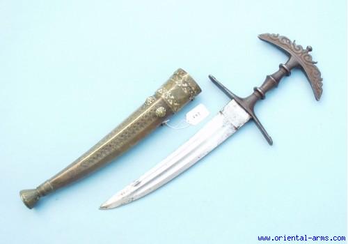 Whatever is the right name, this 18 Century dagger is probably coming from North-West India. It has a slightly curved blade and typical wide pommel and cross guard. The sheath is engraved brass, open at the back side.