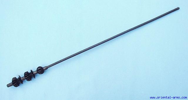 We offer for sale this 18 C. battle mace from India. It is composed of three flanged heads, with 15 densely packed blades forming two big 2 inches wide and a smaller 1 ½ inches wide heads Total length of the fighting heads is 8 inches. It is mounted on a 32 inches steel haft with a steel button at the lower end. Very good condition. Some blades are slightly loose and moving.