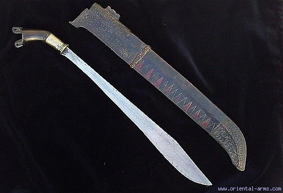 Up for sale is this very rare sword of the Batak people of Sumatra, also known as Piso Sanalenggam . The 18 inches blade has a straight back, dropping down at its end, and a up-curving edge widest at its lower part. Horn grip split at the pommel, brass collar and a painted and carved wood scabbard. A similar sword (with a slightly different scabbard) is shown in: Albert G. Van Zonneveld, Traditional Weapons of the Indonesian Archipelago , page 109, Fig. 431. Very good condition. |