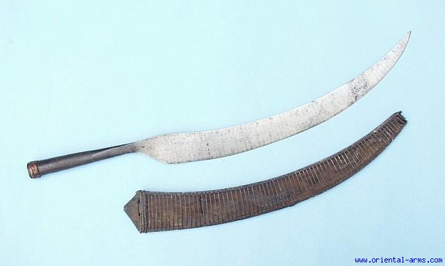Up for sale is this very rare long knife / machete from the aborigine tribes of Taiwan (Formosa). The heavy single edge up-curving blade is 19 inches long forged in one piece with the tubular grip. Open side scabbard with a steel wires holding the blade in position. Total length 24 inches. Very good condition. The tip of the scabbard is broken. |