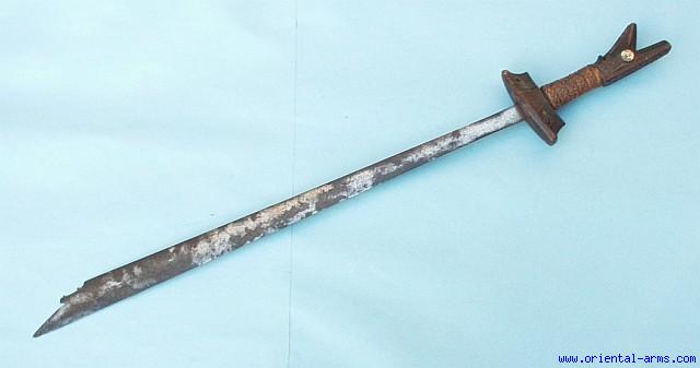 Kampillan - the sword of the see Dayaks of Borneo and Moros of the Southern Philippines. Straight 28 inches long blade, widening toward its tip with curling cuts. Large wood handle with a forked pommel and folded heavy iron wire to catch the opponent blade. Total length 37 inches Good condition. Blackened blade with moderate pitted areas. No scabbard. Very low price. |
