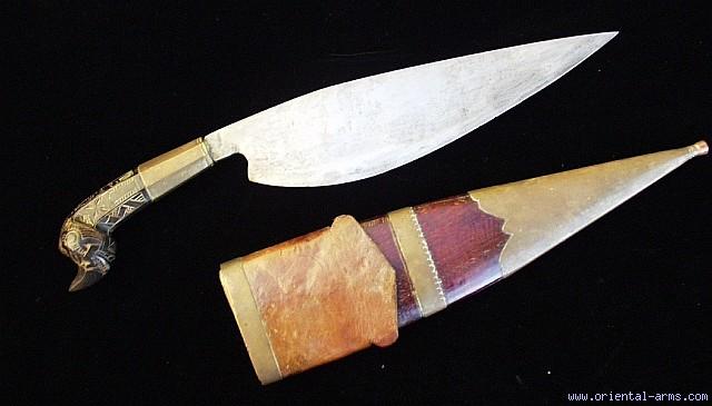Up for sale is this Knife / Dagger from the Philippines. Leaf shape blade with a clear Spanish influence similar to Spanish knives from the 18 Century. It is 11 inches long and almost 3 inches wide. Beautifully carved hardwood handle with a brass collar. Wood scabbard with big brass fittings and partially leather covered. Very good condition.