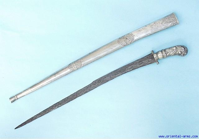 The ‘Pedang’ is an Indonesian short sword, common in Java but can be found also in other Indonesian islands. The blade of this one is 19 inches long, with 11 inches back edge. It is forged from good pamor steel clearly evident. The hilt is covered with thin silver and shaped in a monster head. The scabbard wood is covered with chased and embossed silver in an elaborate design, highly decorative. Good condition. Some minor pitting on the blade tip and a minor damage to the silver on the pommel end. Very good item, dated probably to the second half of the 19 C. |