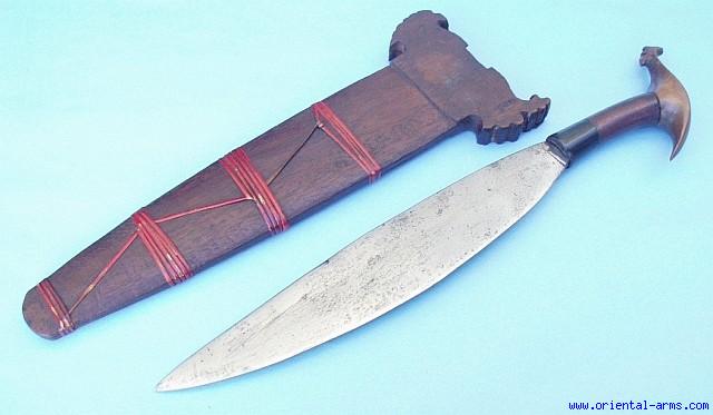 Up for sale is this unusual Barong Sword. 13 ½ inches leaf shape and swollen heavy blade. Wood hilt in a classical form but made up from two wood sectors and black horn collar. Wood scabbard bound with red dyed rattan strips. Total length (in scabbard): 22 inches. Very Good condition. Simple but complete and very effective weapon. |