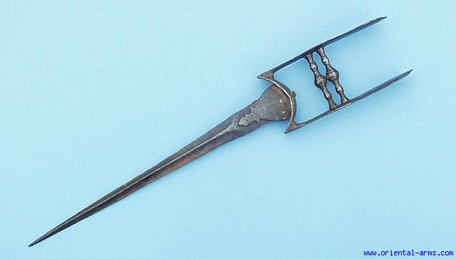 Up for sale is this unusual Kattar push dagger from India. Very old, probably 18 C. with a long 14 inches triangular hollow ground blade, similar to an old bayonet blade and riveted to a whole steel classical Kattar handle. Total length 21 inches. Good condition. |