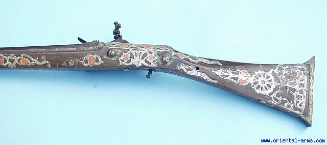Up for sale is this beautiful rifle from Algiers. The long barrel 50 inches is set in dark hardwood butt decorated with silver fittings and corals. The big Miquelet lock is decorated with gold Koftgari work. Total length 64 inches. Very good condition. Few coral pieces are missing |