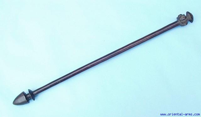 Up for sale is this wooden club from the New Hebrides - A lethal weapon in the experienced hand. 4 X 2 ? inches bulbous head. 40 inches long haft with disk shape tip just below a flanged part with 12 wooden blades. All carved from a beautiful dark brown hardwood. A very similar club is sketched in the book Weapons and Implements Of Savages Races by L.A.D. Montague fig. 59 p. 105, originally printed in 1921. Very good condition. Minor chips of the flanged blades. |