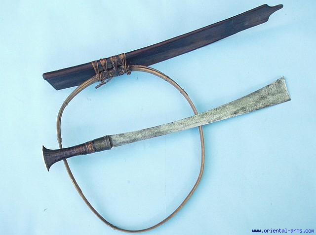 The Naga people of Assam (North-East India) and The Kachin people of Myanmar (Burma) uses this very efficient sword / cleaver. It has a very heavy blade, widening to maximum width at its very top. This one is a classical example. Heavy blade with bevelededge, 20 inches long, 3 inch wide at its tip, forged from laminated steel. Wood grip with flared pommel bound with lacquered braided rattan fibers and with a bone pommel cover. Brass grip collar. The scabbard is open on one side, bound also with rattan bands to hold the blade in place, including the complete rattan made carrying belt. Total length 33 inches (in scabbard). Very good condition. Blackened spots and minor edge nicks on the blade. Minor cracks in the scabbard. All authentic. No repairs or restorations. |