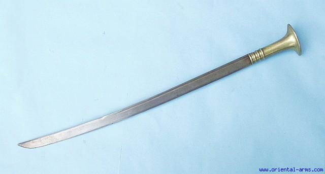 The Gurade is the common name for a saber in Ethiopia. Ethiopian Gurade swords will usually employ European military saber blades (some specially made for Ethiopia by Wilkinson Sword Company in the UK) and a wood or horn handle of a characteristic form. Up for sale here is this very unusual Gurade with a brass cast handle. Blade length 25 inches with a 10 inches back edge. 30 inches total length. Very good condition with good patina on the blade. No scabbard |