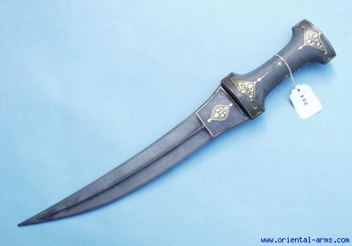 A very good 18th Century Persian whole steel Jambiya. High quality wootz blade and steel hilt, both decorated with gold Koftgary.