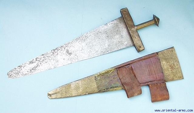 A very unusual example of the Takouba - Sword of the Tuareg, with a blade of exceptional dimensions: 25 inches long, more than 6 inches wide at the top. The blade has two copper dots inlaid near its tip. The handle is brass engrave with geometrical design and the scabbard is tooled leather with similar brass mounts. Good condition. Some pitted spots near the tip. The scabbard tip is slightly damaged. Very Unusual Find |