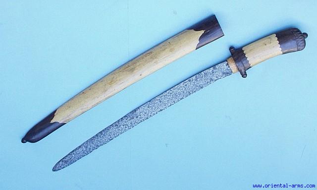 Up for sale is this very old, probably 18 C. Pedang blade, 18 inches long with an 8 inches back edge, forged from good pamor steel (but worn with age). The blade is mounted on a newly made wood handle and wood scabbard made from light and dark wood parts. Total length 25 inches. Beautiful scabbard. Blade worn, Scabbard in very good condition. Very attractive price |