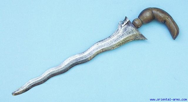 This Bugis Keris Dagger has a heavy old wavy blade 12 ½ inches long, with clear and rare pamor structure. The hilt is carved from engraved Rhino horn with clear fibrous structure. Total length 16 inches. No scabbard. Very good condition. Tip f blade is slightly re-shaped (?). |