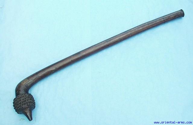It is very seldom that you see such rare items on the market at a really reasonable price.. This early 19 Century war club also known locally as Toko, and in the tribal collectors world as Pinapple Club , is coming from Fiji island. The 36 inches long, heavy club is carved from dark hardwood, usually taken from the root of the tree. The 4X4 inches head is perpendicular to the handle and is carved with lines of sharp teethes all around, ending with a conical spike. The bottom end has a clear phallic shaped. This item is coming from an old collection as can be determined from an old label glued on the handle. Good condition. Shining age patina. Worn teeth on the head and the tip of the spike is slightly shortened from an old breakage. Age cracks on the handle but still very solid. A real piece for the connoisseur of Ethnographic/Tribal artifact and the weapon collector. See also: G.C. Stone, Glossary... Page 184 fig 232 # 10. |