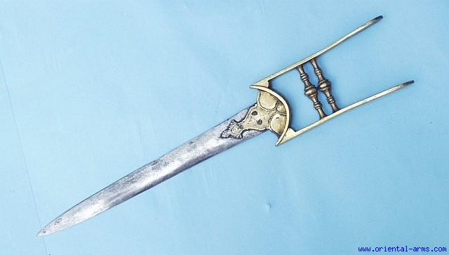 We offer for sale this very old, probably early 18 C. Kattar dagger. The 13 inches blade is riveted to the blade reinforcement plates. Flared side bars and nicely chiseled cross bars. The side bars and the cross bars are gold washed which is mostly intact. Total length 19 inches. Very good condition. No scabbard. |