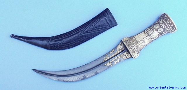 A good example of late18th Early 19th C. Persian Jambiya. The 9 inches curved blade is beautifully forged with a central rib, from fine Persian wootz (Damascus) steel. The hilt is a solid piece of walrus Ivory. Classical ‘I’ shape and carved on both faces with male and female figures and with Islamic inscription. The Blade has gold inlay decoration on both sides at the top. The scabbard is wood covered with tooled black leather and metal tip. Very good condition. The grip carving has a nice age patina. There are some blacken spots to the blade. Total length is14 inches |