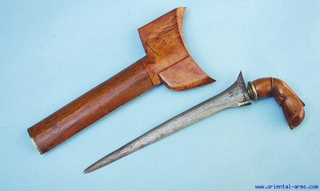 This Bugis Keris Dagger has a very old straight blade 11 inches long, with clear pamor structure. The mendak is engraved brass. The hilt and scabbard are carved from beautifully grained wood in a classical Sulawezi style. Brass scabbard tip. Total length 14 inches. All parts original, no repairs or replacements. The blade has a small area of layer separation but otherwise all is in very good condition Very reasonable price. |