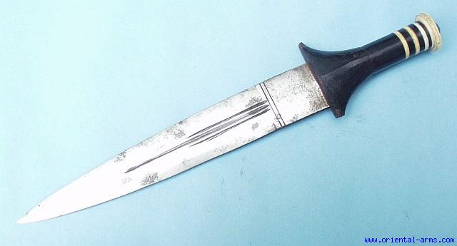 The most common concealed weapon in the Sahel, from Sudan to Mauritania is the arm dagger. It is worn on the arm under the sleeve blade up, grip down so it can be easily drawn, ready for use. The arm dagger varies in size and shape, but all has similar dual edge blade, I shaped grip with a disk pommel and a leather loop attached to the upper part of the scabbard. Here we offer for sale such a dagger, an early 20 C. from Sudan. Good quality. Blades is 9 inches long, double-edged and very sharp. Grip is African Black Wood with bone disk pommel. This item is coming with an authentic scabbard (not shown) but the scabbard is too short for the dagger. Very good condition. |