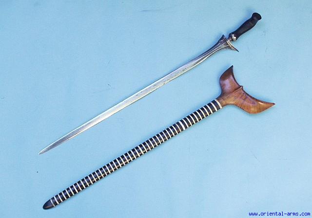 Up for sale is this unusual execution keris dagger / sword from Sumatra. This rare type of Keris was used to execute criminals. The long narrow blade was inserted above the collarbone of the sitting executed person and pushed down directly into the heart, causing instant death. The blade of this specific Keris is 21 ½ inches, narrow but thick and sturdy with acute tip and very heavy. The hilt is beautifully carved horn. The mendak is silver (recent). The scabbard is composed of many tenth of alternating horn and bone grips, and with a horn tip and polished grained wood mouth. Total length ( In scabbard) 26 inches. Very Good condition. Minor wood chips and cracks on the top of scabbard and old repairs. One of the bone rings is a replacement. This is a very rare version of the Indonesian traditional sword. |