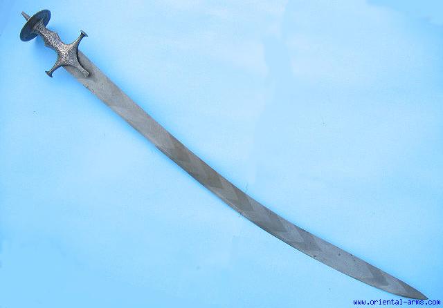 Up for sale this beautiful and rare Indian sword with Chevron design blade. The 34 inches blade is made from alternating segments of pattern welded steel in light color and steel without apparent pattern etched in dark color. the welding is perfect so it looks one single piece of steel. Hilt has nice silver inlay. Total length 39 inches. Heavy sword. Very good condition. |