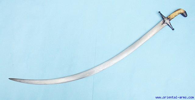 A Shamshir, the Eastern saber that for centuries enchanted the world and was copied in practically all armies of the western world. A light. Deeply curved, wedge shape blade of minimal and simple design and yet a lethal slashing weapon in the experienced hand. Here we offer for sale a somewhat unusual Shamshir sword, with a fine Persian 18 C. wootz blade, marked with a maker stamp. Ivory grips handle with a down curving steel pommel. Steel cross-guard with silver inlay decoration. Blaqde length 31 inches. Total length 35 inches. The relatively short handle with recesses for the fingers, and the silver decoration, may suggest an Indian use of a Persian blade. Very good condition |