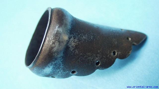 This archer ring is an interesting and unusual item from the variety of the Indo-Persian weaponry. It was worn on the finger and was used both to charge the bow and to release the string. Similar items were used all over the orient. Probably late 19 C. ¾ inch in diameter, 1 inch long, whole steel, excellent condition. |