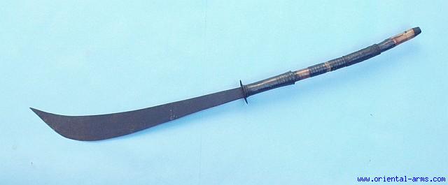 We offer this short sword Dah probably from a Lao origin. More than 16 inches blade, up-curving spine with the edge widening and abruptly rising toward the tip. 14 inches long Bamboo handle with a small crude steel disk shaped cross guard. Brass and fibers bindings on the handle ( partially missing). Good condition. Blackened blade heavy patina. No scabbard. |