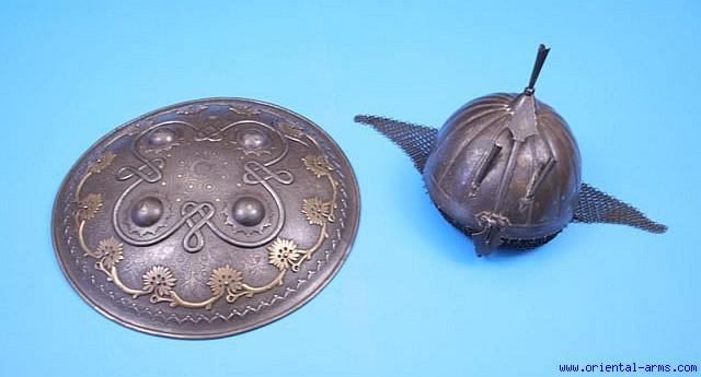 We offer here a nice 18C armor set (almost) from Rajasthan. It has a 14 inches circular convex shield with brass flower scroll and steel snake soldered upon the it. Nice four bosses and silver koftgari inlay to the surface of the shield. The reverse side covered with nice red fabric. The helmet has gold damascene work. There are two plume holders and a movable nasal guard. There is also a nail collar to protect the nack and sholders. The shield is in perfect condition. The gold work on the helmet is worn in some eras. |