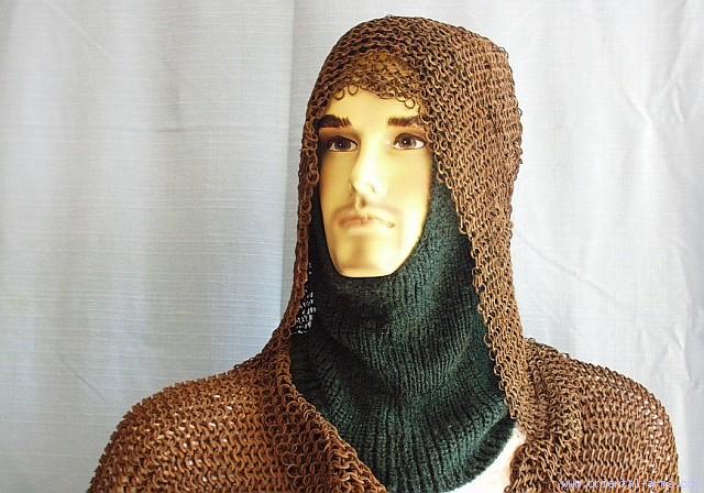 We offer for sale this full and complete 18 C. mail armor from India. Including mail and plates shirt, mail trousers and mail head cover, all composed of many thousands of separate rings each one interlaced with four other rings and each one individually welded and / or riveted (see detailed Photo). This is the most authentic and strongest form of mail armor, in contrary to the later ones with open rings or coiled rings like in key holders. This set was made for a big guy: 44 inches tall shirt and 60 inches wide with sleeves fully stretched. The trousers though are of smaller size. The shirt has two chest plates with two buckles in each plate, and three rows of scales on the back. The head cover is mainly mail with a round disk at the top. Very good condition considering its age and extensive use. Very few holes and missing rings. Good age patina with minor pitted areas on the plates. One scale at the shirt back is missing. IT IS VERY SELDOM THAT YOU SEE SUCH A RARE AND COMPLETE SET FOR SALE. This is very precious and interesting addition to any Indian arm collection. |