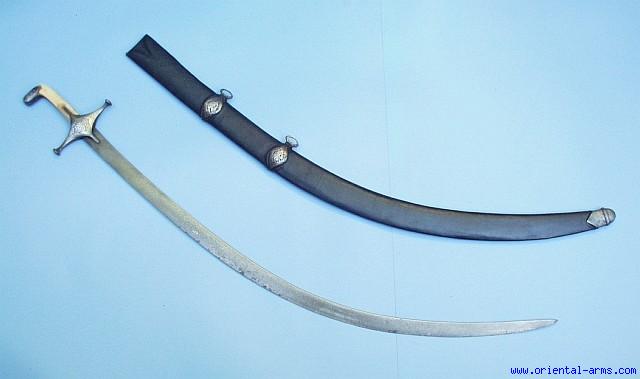 A Shamshir, the Eastern saber that for centuries enchanted the world and was copied in practically all armies of the western world. A heavy, deeply curved, wedge shape blade of minimal and simple design and yet a lethal slashing weapon in the experienced hand. Here we offer for sale a classical example. A 32 inches blade forged from very fine watered steel (Wootz, Damascus) with strong contrast clearly seen on both sides of the blades. Steel cross guard and pommel cap chiseled with Arabic inscription and ivory grips. Wood scabbard covered with black leather and with two belt ring also chiseled with Persian design. Total length 37 ½ inches. Very good condition. Minor blackened spots and battle scars on the blade with very few scratches remained from improper sharpening attempt. Scabbard partially restored and scabbard tip added later. |
