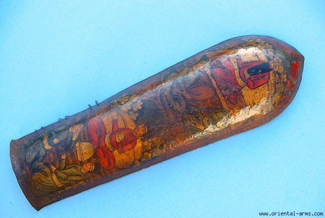 One of a kind, late 19 Century Qajar steel arm guard Bazu Band, painted with the period classical Royal Qajar figures images and colors. 12 inches long 3 3/4 wide with four scenes of seated persons. Some Floral paintings between the scene images. Good condition. Colors bright and vivid in spite of age. Few damaged areas. Inside face covered with old original fabric. A rare decorative item from the qajar period. |