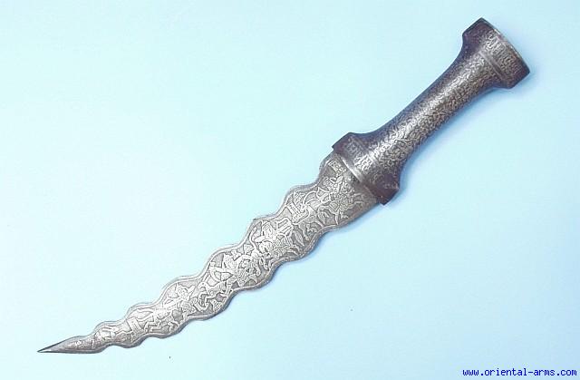 This is a beautiful classical Jambiya dagger from the Persian Qajar period, second half of the 19 C. The curved blade is 9 ½ inches long, wavy, and entirely etched on both faces with various hunting scenes. Thje handle is whole steel also etched with dense floral design. Total length 15 inches. Very good condition with excellent age patina but no pitting. No scabbard. |