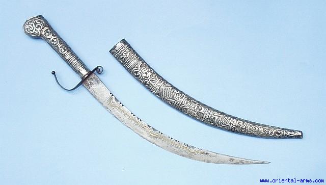 A very decorative presentation “NIMCHA” knife / dagger from Morocco. It has a 12 inches single edge blade of deep curvature. The blade is engraved in a typical design, inlaud with brass and filed on the spine. The hilt and the scabbard are made of wood and entirely covered with intricately chase silver work. Total length 17 ˝ inches. Very good condition. It is not a fighting weapon but a very decorative example and of good workmanship. It is a nice addition to a collection of Oriental Weapon / art, at a very attractive price |
