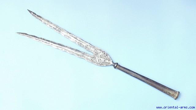 A Persian spear head from the late 19 C. from the Qajar period: Each blade is 12 inches in length both forged together with the 8 inches socket. The base of the blades is etched in a typical Qajar design. Good condition. Minor pitted spots on blade. |