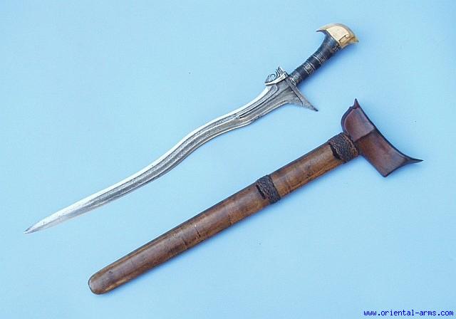 This is a fine Moro Sword, early type, probably early 19 C or earlier. The blade is 18 inches, slender, and fullered. The fullers are etched in a pattern reminding the Twisted Star pattern common to the period in the middle east swords. The execution of the etching is so fine that at the beginning I was almost sure I am holding a real Twisted Star pattern on hand. The handle is wood covered with bands of silver fibers. One silver reinforcing clamp and a brass strip covering the Ganja. Ivory pommel in a classical cockatoo shape with some inscription on it. Wood scabbard bound with braided rattan. Total length 24 inches. Very good condition. There are repairs on the tip of the pommel and the scabbard mouth. |