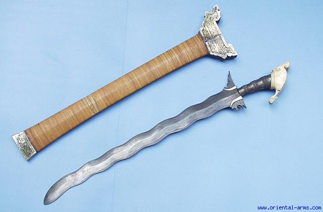 As good as it can get - this Moro Kris sword is a fine representative of its family of swords from the mid 20 C. vintage, 1940 or so. A fine waving blade forged from a pattern welded ( Damascus) steel core forge welded between high carbon steel edges. 23 inches long, deadly sharp and elegantly shaped. The wood handle is entirely covered with silver strips and braided silver wire bands, ending with a huge ivory pommel, very finely carved. Wood scabbard bound with rattan fibers and decorated with engraved and painted Mother of Pearl (MOP) plaques. Next to excellent condition with the exception of minor damages and very few later repaired MOP pieces. |