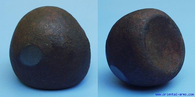 This is a rare and original 18 C. steel ingot from India, made of wootz and coming right out of the crucible ready to be traded and forged into a wootz blade. Luckily it survived and is up for sale. 2 ¼ inches in diameter, 2 inch high, in a ball shape and about 870 Grams weight. A small area on the side was polished and etched to show the wootz structure. Other similar Wootz cakes in weights of 300 - 800 Grams are also available. Unique piece for the weapon collector, steel researcher or blade smith expert. (We should mentioned here some comments we received that this is an old mill ball used to crush ores and not an wootz ingot. This is now being checked) |
