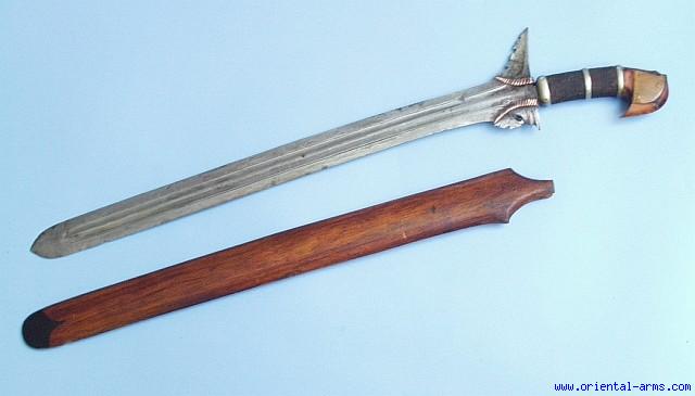 A classical Moro Kris sword, with an old, probably 18 C. blade. 20 ½ inches long, straight, with two central fullers and forged from pattern welded steel. Later, probably late 19 C. wood handle bound with fibers and three white metal bands, and set with two light horn panels on the cockatoo shaped pommel. Two copper clamps (Baca-Baca). Later wood scabbard with painted black tip. Total length (in scabbard) 26 inches. Very good condition. Blade with few forging flaws and edge nicks. |