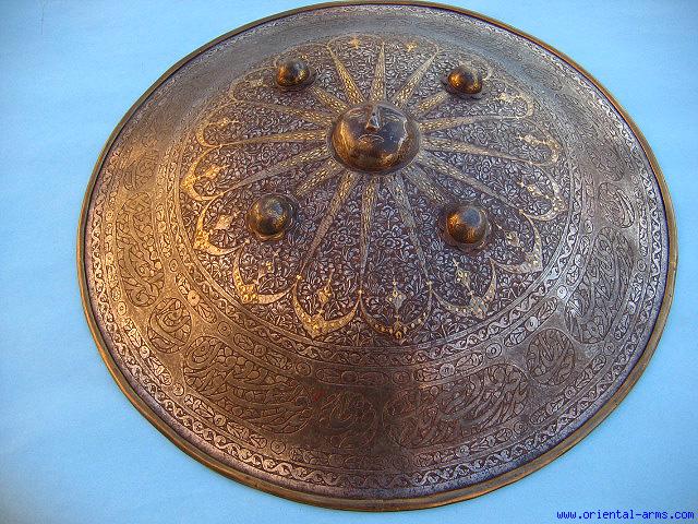 Up for sale is this very fine Qajar style Persian shield from the 1850’s. 20 inches in diameter, whole steel, in elaborate chiseled flowers work, with a central face and Farsi calligraphy on the perimeter. All inlaid in gold koftgary decoration. Very good condition. Good quality chiseling. |