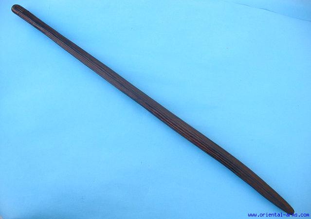 A war club of the Dinka people residing in East Africa. Heavy, 32 ½ inches long, 1 ¼ inches wide, polished dark wood, ribbed on its most length with a small hole in its handle, probably for a wire loop. Very good condition. Excellent age patina. |